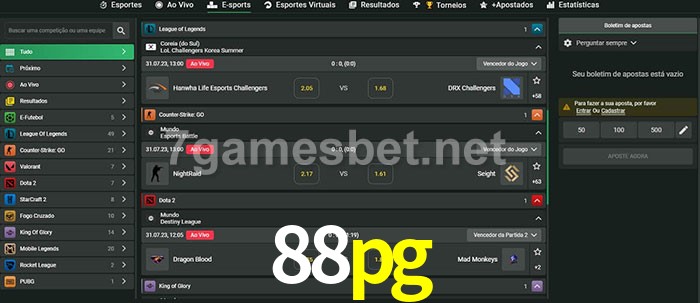 O 88pg oferece uma grande seleção de opções de apostas em e-sports com probabilidades competitivas